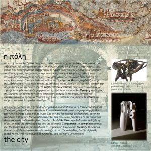 An important inspiration for the design of the exhibition was the text Invisible Cities of the Italian litterateur Italo Calvino, an exemplary presentation of the multifarious nature of the city-port. The text brings in a common narrative a variety of city descriptions that eventually appear to form the multiple facades of one and single city, Venice. In addition, through the dialogues and descriptions of the cities in the text, one can discover various other dynamic interactions, such as the dialogue between two cultures, let’s say Greek and Italian, or the interaction of text and image. The Invisible Cities are fantastic. Through the exhibition they are invited to interact with the ‘visible’, real cities of the Ionian Sea as described in the work of Greek Ionian litterateurs, such as Andreas Kalvos, Dionysios Solomos, Kostas Karyotakis, Lefcadio Hearn, Aggelos Sikelianos, Elisavet Moutzan Martinengou, Maria Polydouri, as well as with cities of Magna Grecia in Italy, through the corresponding ‘Griko’ musical tradition.