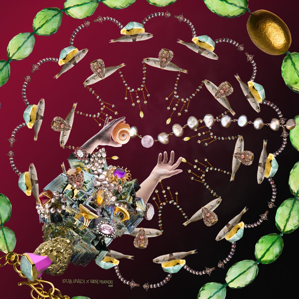 My two artworks refer both symbolically and pragmatically to the essence of ”valued” and ”precious” in the form of the jewelry itself in contrast and in harmony with the natural ornaments of the universe such as the Moon , the Fish, the Shell etc. Moreover even the printing material is chosen to be silk refering to the products people used to exchange or buy near ports that are symbols of wealth , cultural exchange , action and narrative.