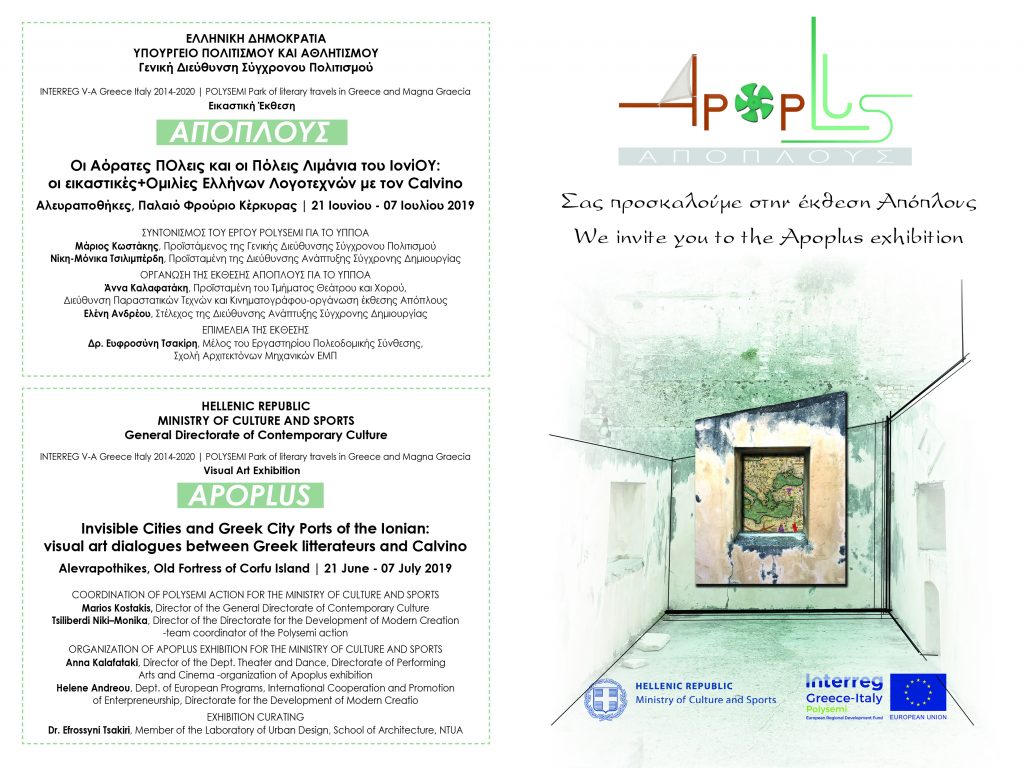”The Exhibition APOPLUS, Invisible Cities and Greek City Ports of the Ionian: visual art dialogues between Greek litterateurs and Calvino, is organized by the Hellenic Ministry of Culture and Sport, General Directorate of Contemporary Culture, in the framework of the action “Park of literary travels in Greece and Magna Graecia”, with the acronym POLYSEMI of the “INTERREG V-A Greece Italy Programme 2014-2020“. The exhibition will be hosted at Alevrapothikes building in the Old Fortress of Corfu. The exhibition will be inaugurated on June 21 and will run until 7 July 2019.
