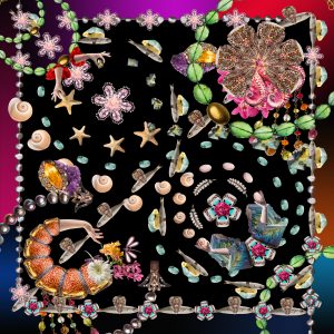 A special collaboration took place during spring 2018 when i was in charge of an Extra Special Project: To photograph the  precious  30 year old jewelry collection of Eleni Marneri Gallerie in Acropolis, and create  a special iconography-visual art, whose destiny would be its transformation- denutation  into highest quality silk scarves. The outcome  during the months: end of March and April ,was the creation of 17 artworks , a selection of them become silk scarves and their presentation to public on May 4th in Gallerie of Eleni Marneri. Below you can find a note i wrote for describing this unique assignment: