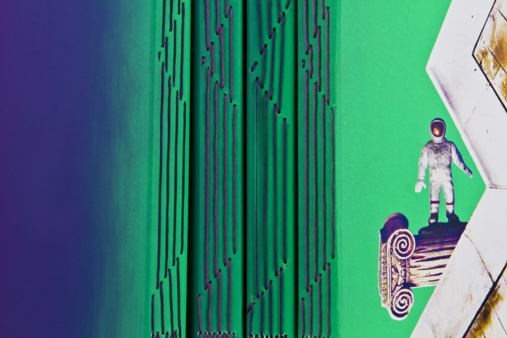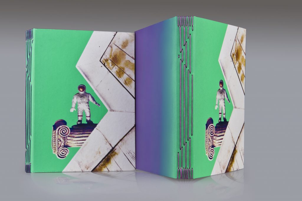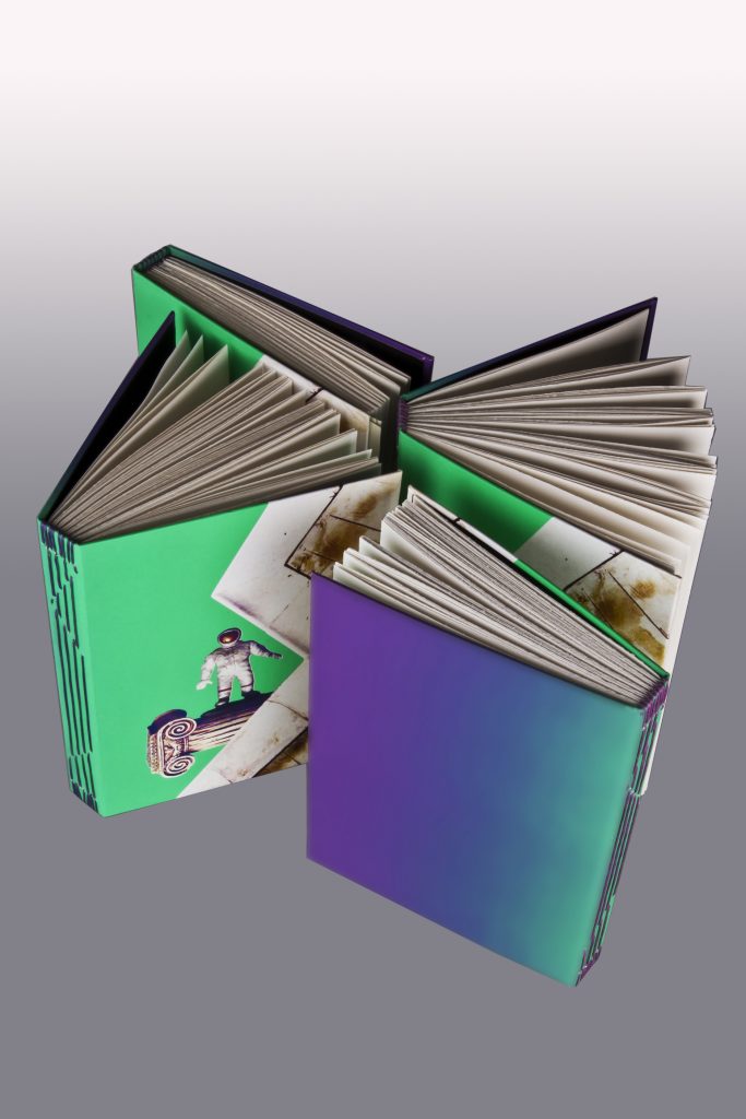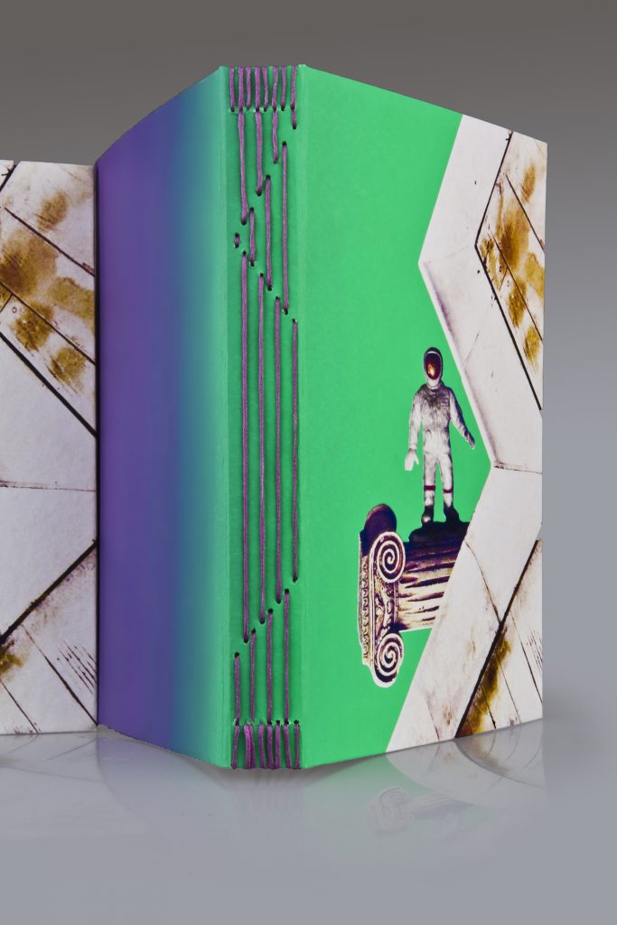 It is created by the exposed sewing method, with a hand made binding and belongs to a limited edition of 35 copies. A high quality paper, Conqueror Wove High White 120gr is used and it is ideal for sketching, writing and drawing. The binding in the spine of the book follows harmonically , the lines of the column of the cover, so that a synchronized agreement between the visual and the binding part will emerge.