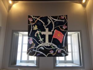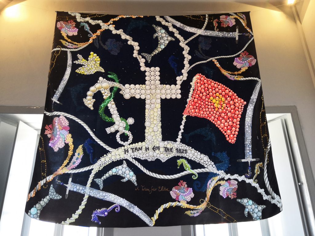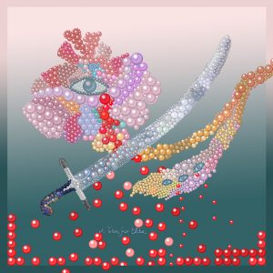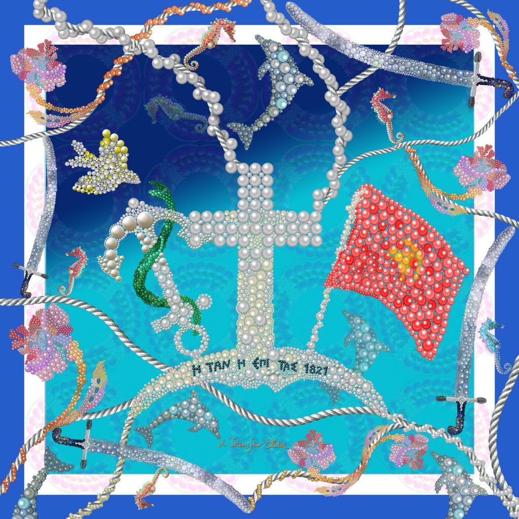 My second artwork was a pearl interpretation of the Greek flag of the island of Hydra during 1821 revolution from Turks. Using the main iconography of the original flag:the anchor stands as a symbol of hope and victory during battleships and the snake wrapped in the anchor symbolizes the power of hellenic nation. The bird stands for the wisdom with which Greece must fight for freedom. The upside crescent moon is symbol of Islam and the cross over it highlights the power of Christianity . The phrase written ”η ταν η επι τας 1821” in the ancient Greek language means or on the shield (beaten) or with the shield (winner). I used the pearls in order to give a luxury tint, a fashionable tint, a ”light” tint of a battle that set thereafter the new face of Greece, liberated from the Turkish Yoke. Then i enriched carefully the composition with various elements that i chose like dolphins, seahorses, chains, ropes, the flower of hydra, swords and a starry night, to create a decorative web respecting the historical identity and at the same time creating a modern version -atmosphere.