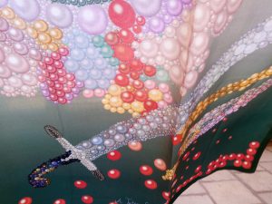 My participation in Hydra was a composition made of pearls inspired by the flower that we meet in the traditional embroidery of Hydra , but this particular flower is losing its life and its ”blood” by the swords of war-revolution. A symbolic interpretation of the suffering of war. The sword is inspired by the shape of the sword of Admiral Kanaris.